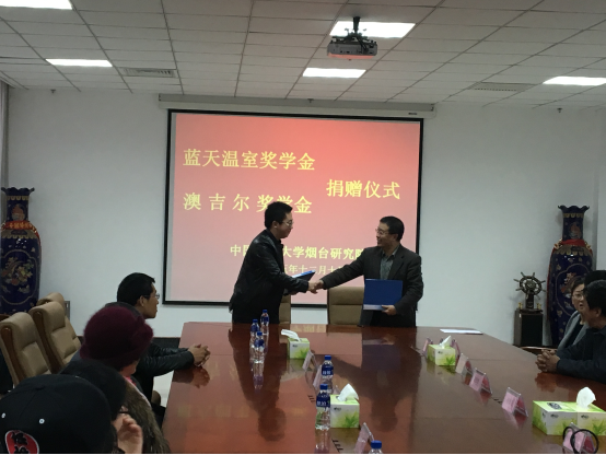 2015年12月10日上午,“蓝天温室奖学金”捐赠仪式在行政综合楼八楼会议室举行。中国农业大学校务委员会副主任、烟台研究院院长傅泽田与青岛蓝天温室有限公司董事长杜紫龙先生在捐赠协议上签字,这项以企业命名的奖学金将用以奖励成绩优秀学生,鼓励学生创新。烟台研究院常务副院长李兴佐主持捐赠。 根据协议,“蓝天温室奖学金”主要用以奖励设施农业科学与工程、市场营销两个专业表现优秀的学生,奖学金设立期限为5年。杜紫龙表示,在烟台研究院设立奖学金的初衷就是希望学校对口专业的同学毕业后能把全部所学用到这个行业上,让这个行业更加健康稳固发展。