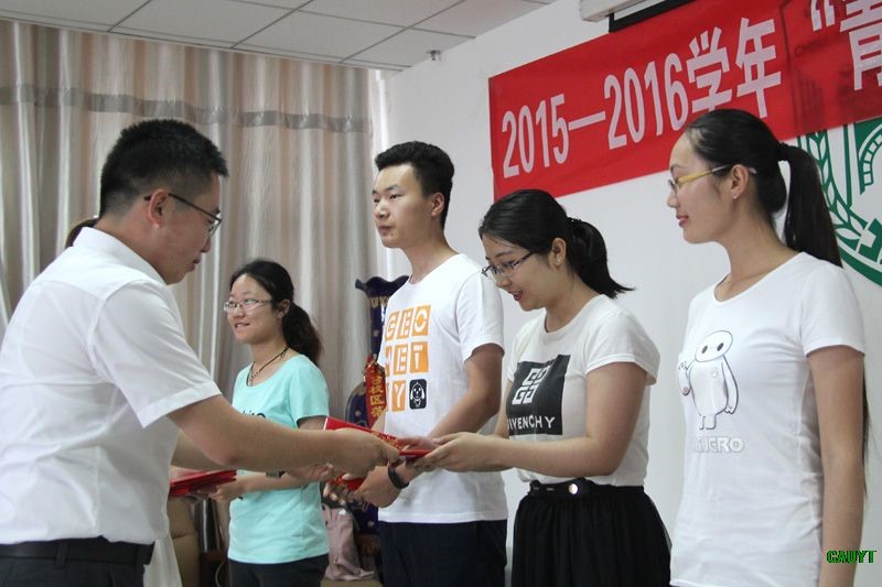 6月13日下午,“蓝天温室奖学金”颁奖典礼在八楼会议室举行,设施农业科学与工程与市场营销两个专业首批14名个人和10支小队获得“蓝天温室奖学金”奖励。烟台研究院常务副院长李兴佐、青岛蓝天温室有限公司总经理杜紫龙为在2015-2016学年赛事和企业实习过程中表现突出的同学颁发奖金。