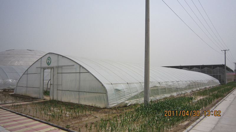 主体骨架(采用热镀锌钢管组装结构)覆盖薄膜组成的圆拱形温室。除圆管外,可用椭圆管制作以加强强度。