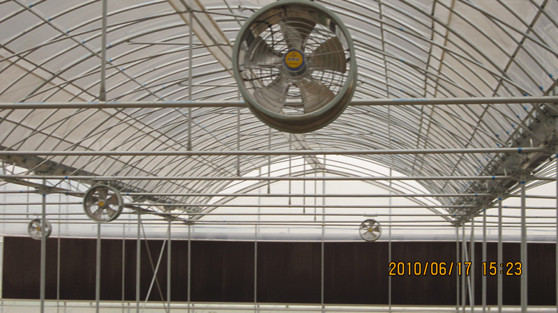 单层骨架双层充气膜温室就是温室的周边顶部均采用单层热镀锌钢骨架,顶部采用双层充气长寿无滴膜覆盖。双层充气膜温室是一种节能型温室,与单层塑料膜温室相比具有显著的保温效果(一般节能30%以上)。双层充气膜温室不用压膜线,只在塑料膜的四周固定,靠充气泵机向两层膜之间充气来支撑塑料膜,使内层塑料膜紧贴温室骨架,外层塑料膜靠气压与内层塑料膜隔离,从而形成空气夹层,产生保温作用。周边钢骨架的内外各覆盖一层长寿膜,保温性能优良,能有效的节约采暖能耗,适合于冬季使用。周边内外层均可安装卷膜窗系统,顶部可采用电动齿轮齿条外开启天窗,通风效果良好。